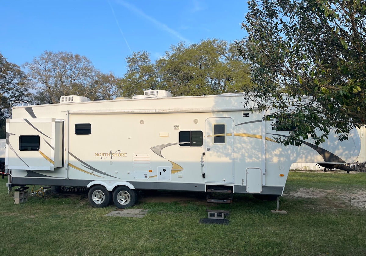 Dette er din base for at få familie- og vensminder på Emerald Coast, der ligger kun 30 miles fra stranden! 9 fods lofter i dette 5. hjul giver dig mulighed for ikke at føle dig trang som normal træk bag autocampere, 4 vejs køjeseng, queensize-seng og på 32 fod med 2 rutsjebaner, det føles som et lille hjem i stedet for en campingvogn. Wal-mart ligger kun 9 minutter væk og 1,5 badeværelser I autocamperen med en dejlig stor gasgrill udenfor... masser af plads til at parkere 3 køretøjer her, hvis det er nødvendigt!!