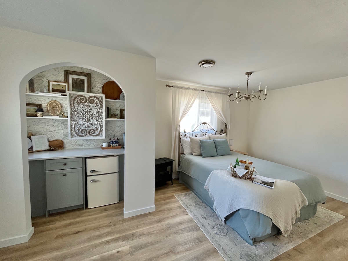 2020 bygget, hyggelig 450 kvadratmeter, selvstændig 2. etage Studio Suite beliggende i det meget populære turistkvarter Penticton. Vi er fuldt licenseret og overholder de nye BC-regler om korttidsudlejning. Kyst-/strand tema par/singler retreat 3 blokke (5-10 min) gåafstand til Okanagan Lake. Gå til SOEC, konvention, casino, fælleshus, Farmers Market, Wine Experience Centers, centrum, shopping, marina, kunstgallerier, golf, restauranter ved søen og meget mere.