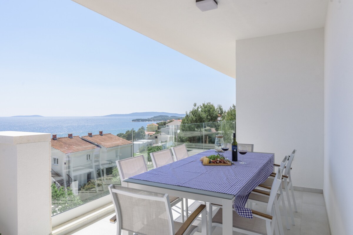 Lejligheden er beliggende på første sal i huset. Der er to soveværelser. Et soveværelse har to senge, mens det andet værelse har to enkeltsenge. Lejligheden har Wi-Fi , aircondition, et køkken og en balkon med udsigt over havet. En stor parkeringsplads er placeret foran huset. Grillen er placeret i huset og kan også bruges frit. Kæledyr kan indkvarteres for 5 euro/dag. Lejligheden ligger 100 m fra havet, 4 km fra Trogir, 10 km fra lufthavnen og 27 km fra Split.