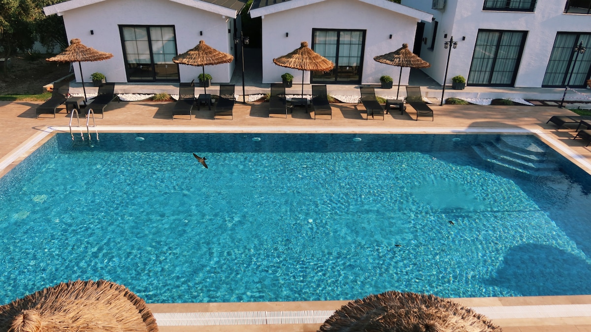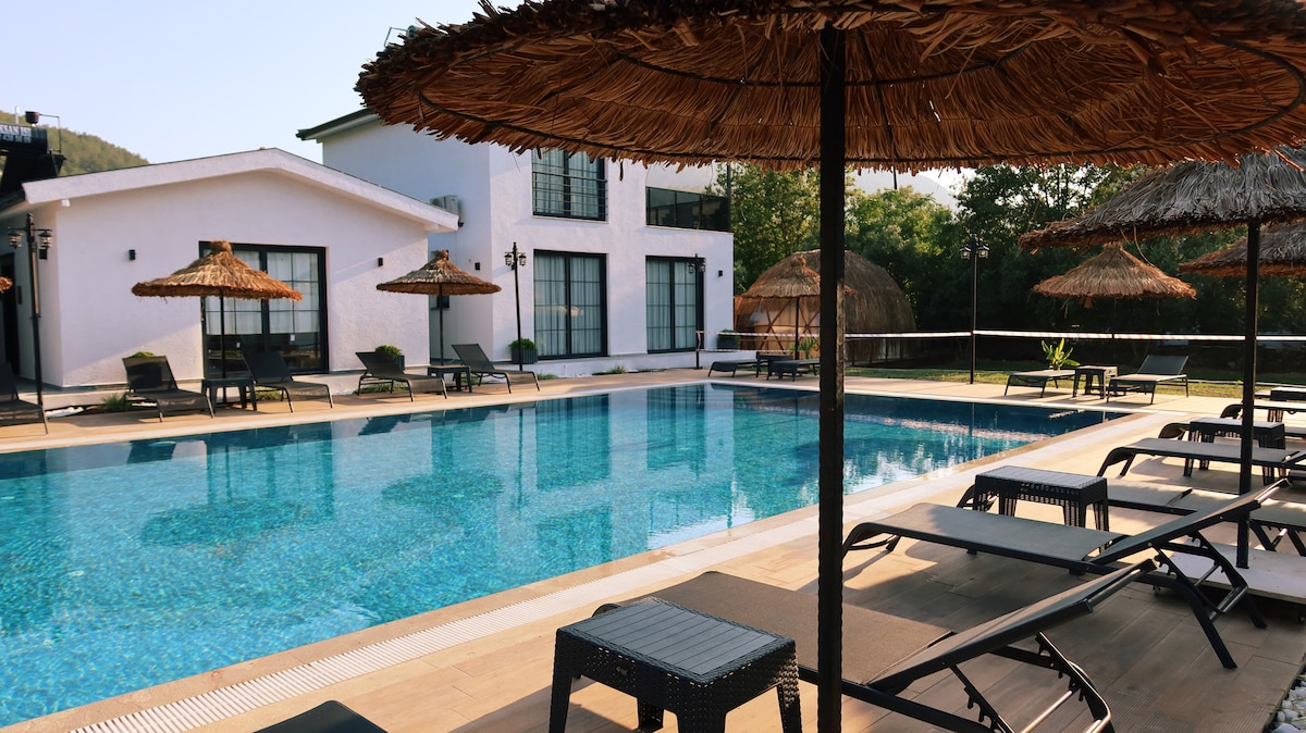 Du vil elske vores suiteværelser, der vil skabe en unik oplevelse med sin stilfulde indretning indrettet i en bohemeagtig stil. *Oludeniz 4,8 km *Marked:350 m *Fethiye Center: 8,2 km *Hivaronu: 2 km *DalamanLufthavn: 55 km *Fethiye Otogar: 6,9 km Vores spabad i rummet har ikke motor, så det kan bruges som badekar. Foretag din reservation med disse oplysninger i tankerne.