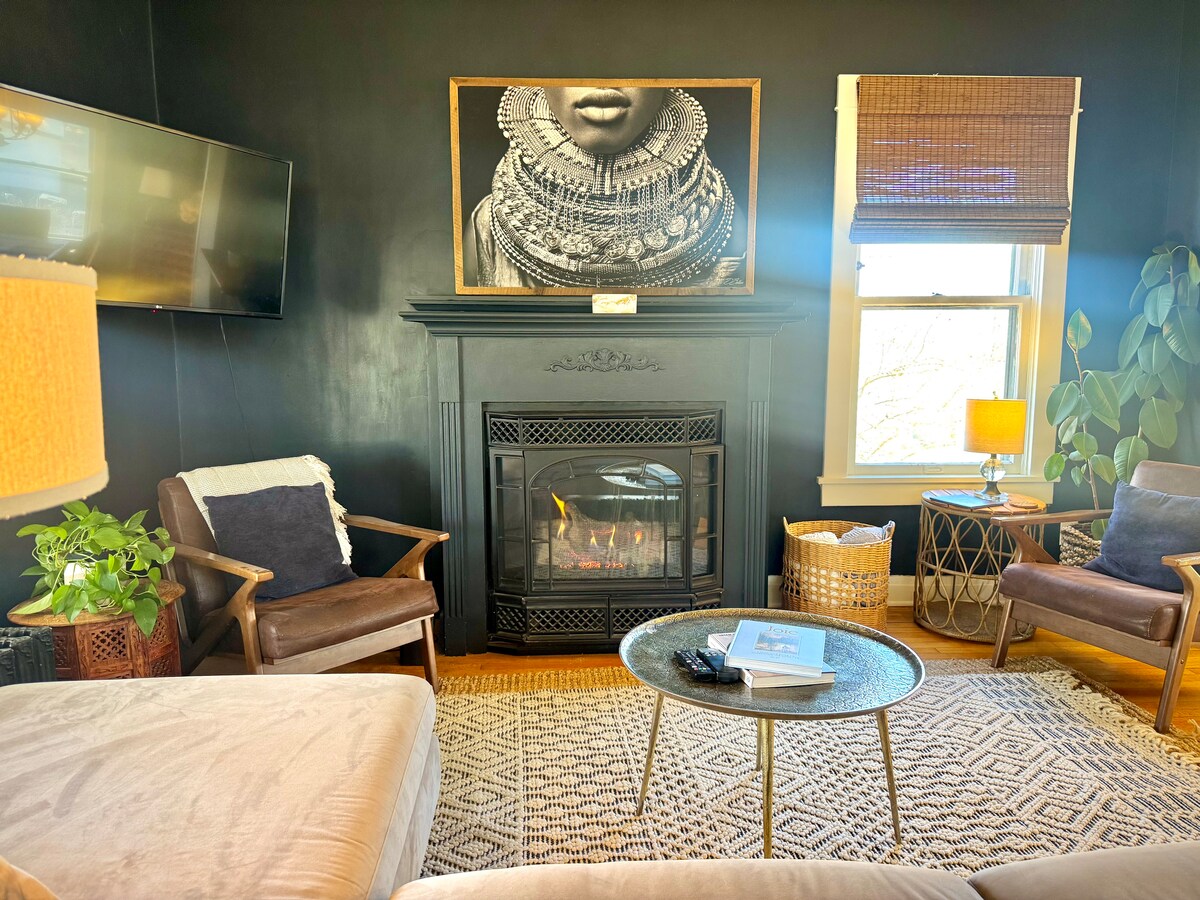 Escape to our Charming Guesthouse a perfect blend of comfort and relaxation. Step outside to enjoy a peaceful patio with a soothing waterfall. Stay comfortable A/C and heating, and cozy up next to the beautiful fireplace. High-speed Wi-Fi and a large TV are provided for your entertainment. On a fenced 3/4 acre lot, access to an outdoor firepit perfect for evening relaxation. Located in the heart of Omaha, you’ll enjoy full city access while still retreating to a peaceful, private setting.