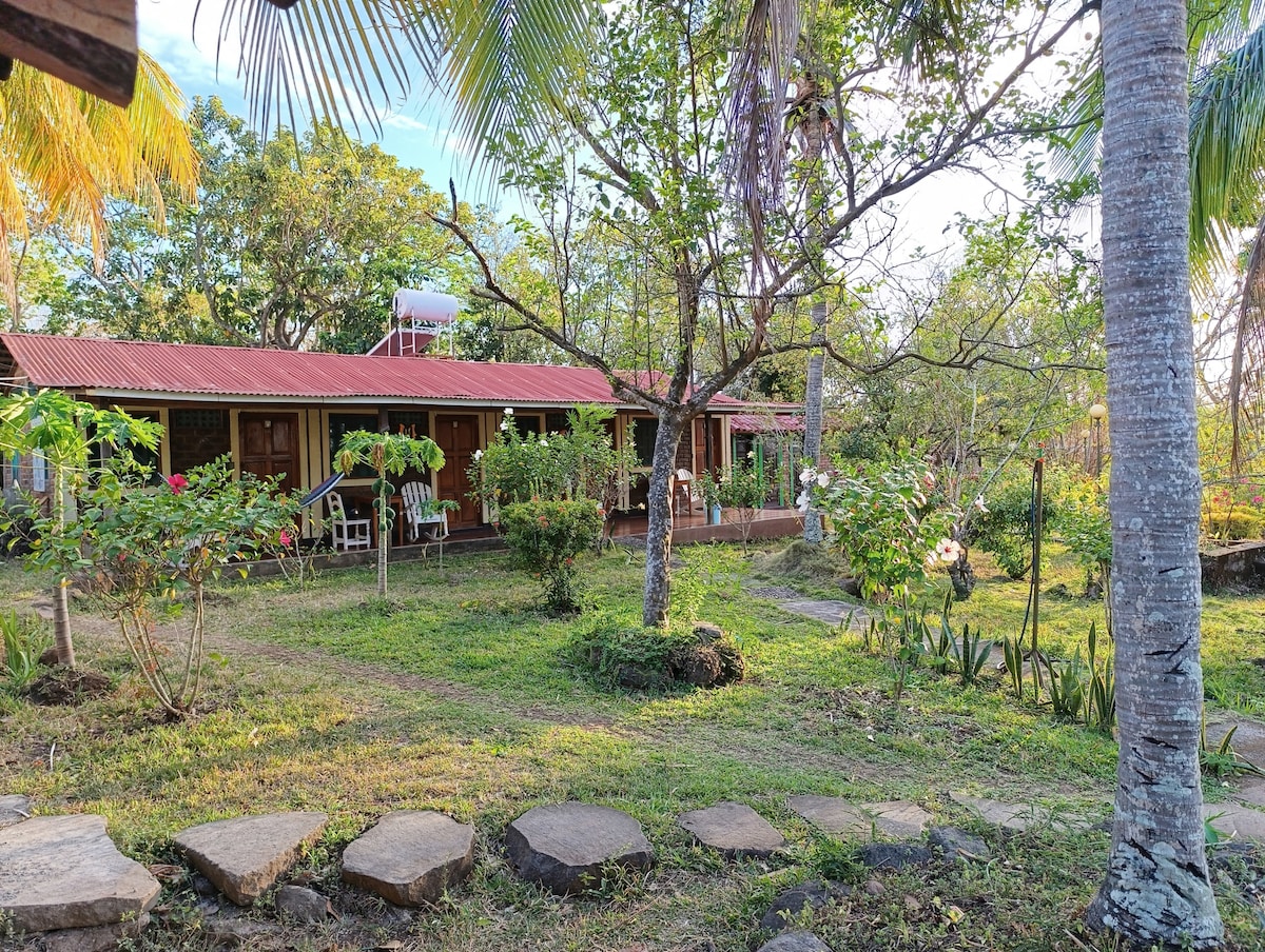 Fredfyldte solopgange på stranden og magiske, rolige solnedgange på Ometepe! Privat bungalow med WiFi, rent soveværelse og badeværelse med varmt vand i bruseren. Terrasse med hængekøje, bord, siddepladser - haver - ejendom ved stranden = længste sandstrand mellem 2 vulkaner på asfalteret hovedvej. Smuk udskåret træ/glasdør og vinduer - alle afskærmet med metalstangbeskyttelse plus loftsventilator. Loft og møbler i naturtræ med 1 dobbeltseng og 1 enkeltseng. Keramiske fliser. Parkering/daglig rengøring! Måltider/vaskeri ekstra. Rundture