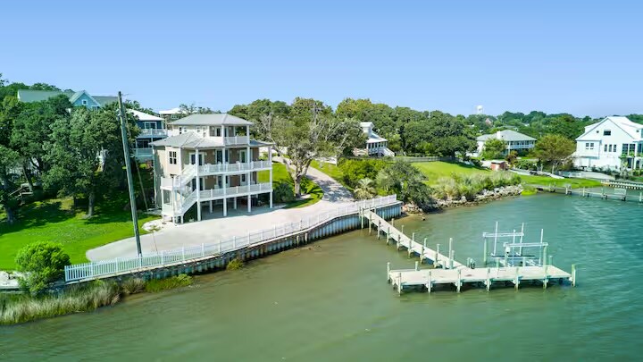 Hjem ved🌊 vandet med havudsigt og gåafstand til Swansboros centrum Tag på ferie i denne fantastiske feriebolig ved vandet direkte på Intracoastal Waterway, der tilbyder betagende hav- og indløbsudsigt nær downtown Swansboro, NC. Denne bolig er perfekt til familier eller grupper og kombinerer luksus og bekvemmelighed med en afsondret kystfølelse. Nyd tre balkoner med et ørnered, panoramaudsigt, der strækker sig mod Bogue Inlet og Atlanterhavet, en perfekt udsigt med et glimt af solopgang og solnedgang.