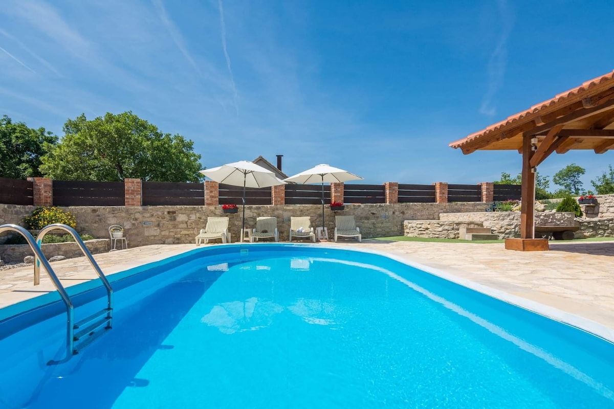 Autentisk middelhavsstenhus med stor opvarmet pool (30 m2 med jacuzzibænk) i landsby nær Zadar. Samlet areal er 300 m2 med privat parkering, have, stor opvarmet pool, 6 liggestole i træ og to store terrasser med lounge. For sjov er der billard, bordtennis, fodboldmål, picado. Huset ligger i en lille landsby væk fra byens støj. Det har en smuk åben udsigt over naturen og bjergene. Du kan nyde fuldstændig privatliv. Huset er omgivet af marker, og du kan se husdyr