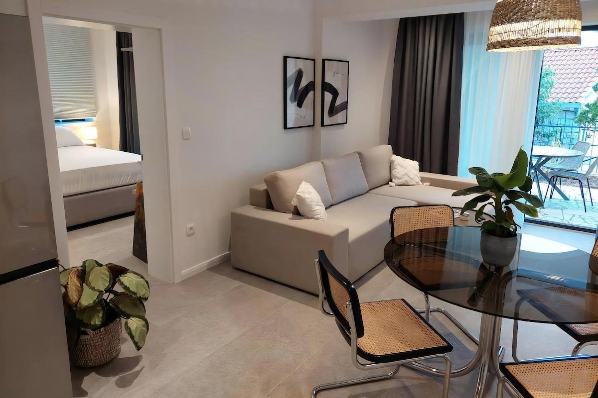 Velkommen til vores helt nye toværelseslejlighed beliggende på en lille bakke med en fantastisk havudsigt fra balkonen og parkeringsplads. Vi tilbyder gratis parkeringsplads til vores gæster. Mlini har sine egne lave småstenstrande og beskyttede bugter, blomsterfyldte haver og stier, hoteller, floder og sommerboliger. Vores lejlighed ligger kun 400 meter fra havet og 10 kilometer fra den gamle bydel i Dubrovnik, med regelmæssige busser og bådshuttles, der forbinder Mlini med Dubrovnik og Cavtat.