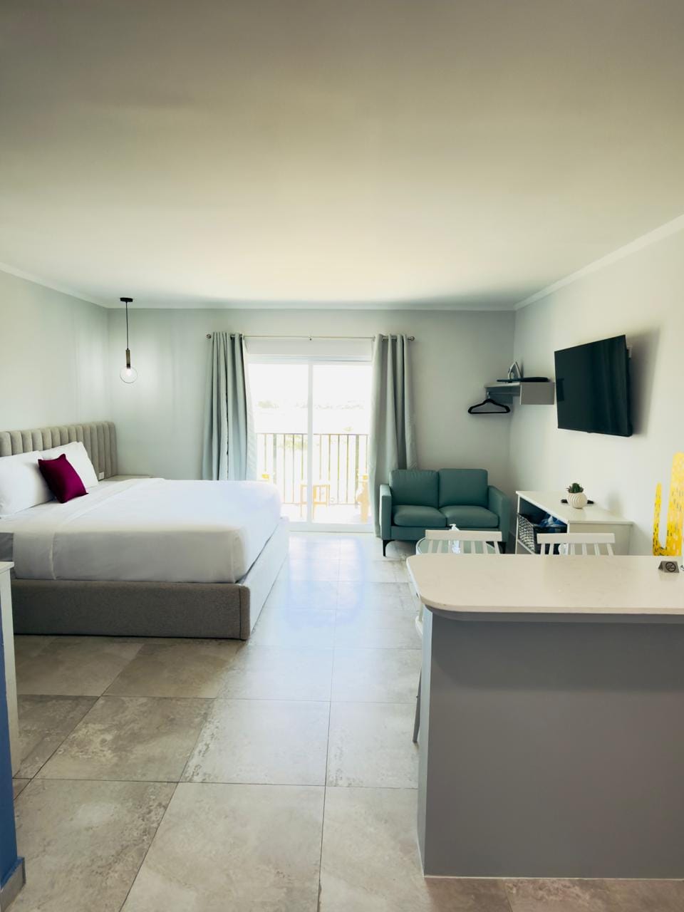 Denne smukke lejlighed afspejler Arubas blå farver med et meget moderne og RENT design, der tilbyder en meget komfortabel kingsize-seng og kingsize-puder, et fuldt funktionelt køkken, smukt walk-in-closet, moderne badeværelse med spa-lignende regnbruser. Beliggende på bygningens øverste etage med en fantastisk udsigt over Arubas centrum samt havnen! Nyd infinitypoolen og spabadene på taget med 360-graders udsigt og topmoderne fitnessrum med udsigt over vandet og krydstogtskibe!