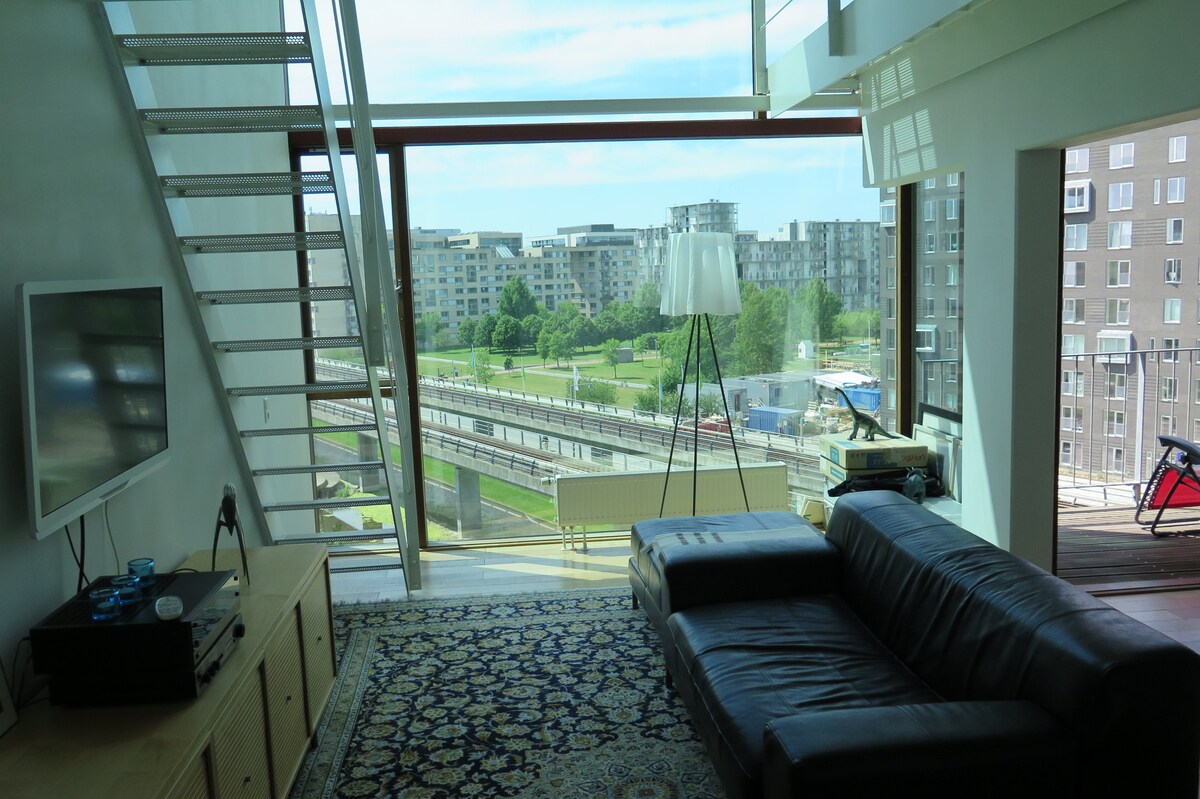 Unik og meget lys lejlighed med to soveværelser, der er perfekt til et par eller venner, der besøger København på ferie eller overnatter. 270 graders udsigt over byen og hurtig adgang til byens centrum, Nørrebro og Vesterbro. Smart hjem, hvor lys og rengøring styres fra iPad.