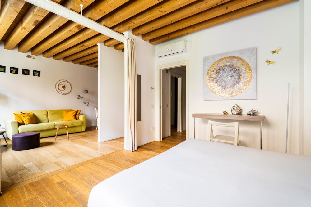 Dette rummelige loft med designstil og udsigt over haven er en sjældenhed i Venedigs historiske centrum. Bygningen er den elegante ombygning af et gammelt varmeanlæg, der er genindrettet af arkitekter i boligen i 2010. I en rolig lille gade, men et par minutters gang fra tog-/busstationerne, Grand Canal, supermarked, restauranter, butikker. Ideel til at udforske den 1600 år gamle by til fods, uden at opgive den levestandard, du er vant til i dag, herunder højhastigheds-wi-fi, elevator, dampbad.
