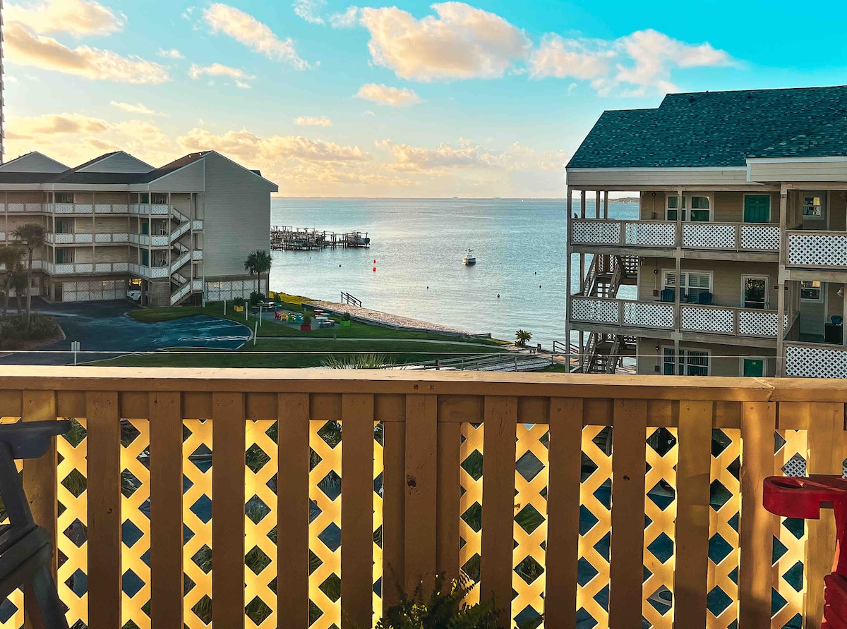 Alt inkluderet! For nylig ombygget lejlighed ved vandet med hvælvede lofter beliggende på Little Sabine Bay og få skridt fra Den Amerikanske Golf. Nyd kaffe og cocktails på en fantastisk balkon med udsigt over bugten. Gå eller cykle til shopping, spisning og Gulfside. 1 soveværelse lejlighed med et loft. Den åbne stue/køkken har en 7' ø. Senge inkluderer King i master, queen i loftet og en queen sovesofa. 1 overdækket parkeringsplads. 2 cykler 2 oppustelige paddleboards er også inkluderet.