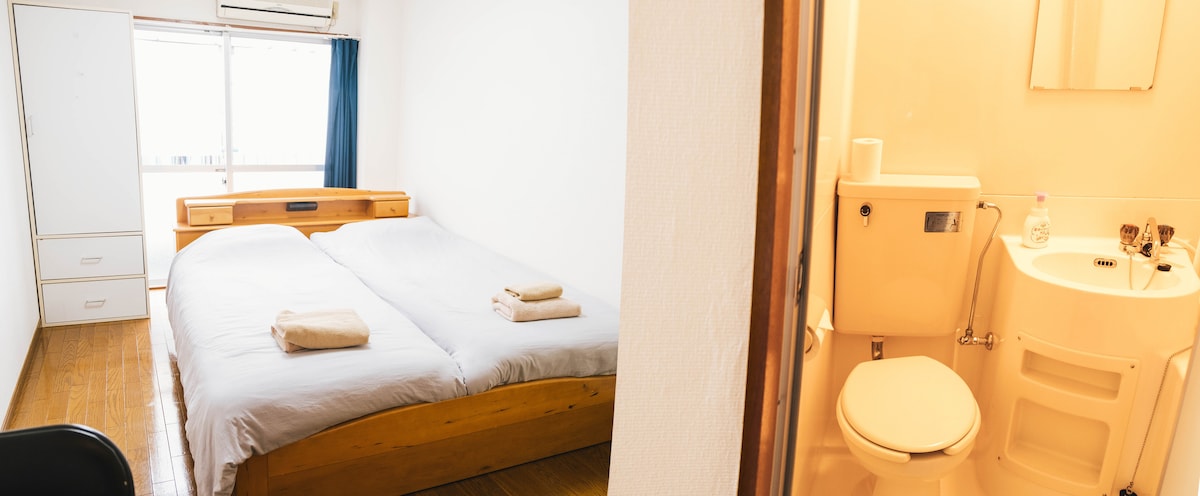 Hyggeligt privat enkeltværelse i en førsteklasses beliggenhed i Osaka! Kun 4 minutter til JR/Metro - 4 stationer til Tennoji, 3 til Shinsaibashi. Gå 12 minutter til Osaka-slottet. Supermarked 1 minut væk, plus mange autentiske overkommelige restauranter i nærheden. Fælles faciliteter omfatter rent toilet, brusebad og rummeligt fællesområde med fuldt udstyret køkken. Perfekt til solorejsende, der ønsker bekvemmelighed, lokale madoplevelser og nem adgang til Osakas højdepunkter.
