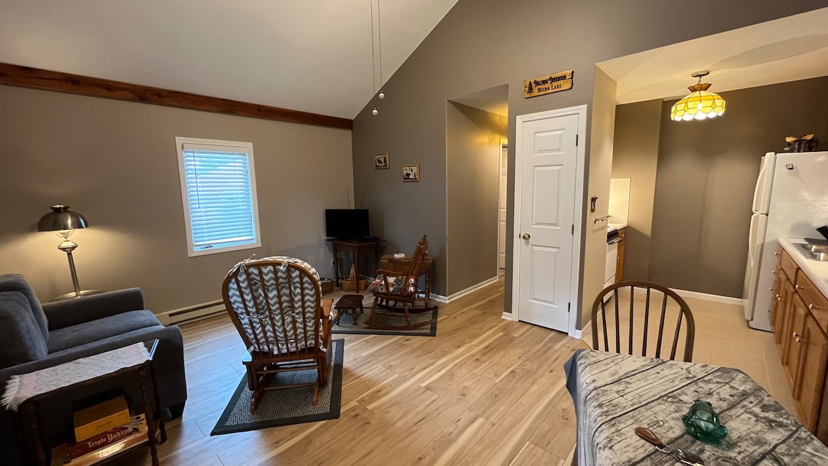 Du får hele kælderen - to soveværelser, badeværelse, lille køkkenområde og stue - for dig selv. Vi er i et skovområde et par kilometer fra byen. Du kan nyde din egen terrasseindgang (ud over dammen) med adgang til et bålsted. Vi er tæt på White Pine Trail. Vi tror, du vil synes, at stedet er fredeligt og hyggeligt. Der er en trappe til ovenpå, men den er afskærmet med gardiner og dækket med skumplader for at give privatliv. Du har hele etagen og indgangen for dig selv!