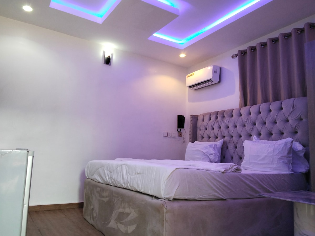 Moderne korttidsudlejning i Asaba Nyd en stilfuld 1-værelses lejlighed med aircondition, strøm døgnet rundt og gratis wi-fi. Perfekt til korte eller lange ophold. Har en queensize-dobbeltseng, hyggelig lounge og moderne belysning. Ekstraudstyr omfatter afhentning og afsætning, catering efter anmodning og fester efter aftale. Beliggende i et fredeligt, centralt område tæt på butikker og seværdigheder. Dit perfekte andet hjem i Asaba!