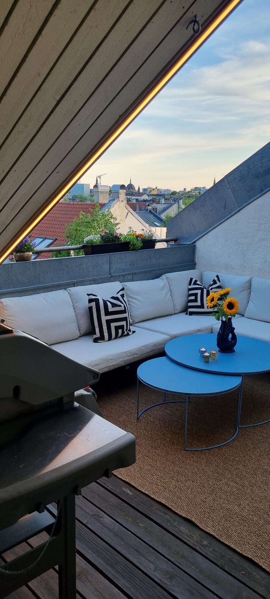 This chic top-floor flat overlooks the lively buzz of Olaf Ryes Plass, placing you in the heart of Oslo's trendy district. Step out to discover a vibrant tapestry of independent shops, cafes, and restaurants. Unwind on your private rooftop terrace, perfect for alfresco dining with BBQ and lounge seating. Inside, the modern kitchen and cozy bedroom ensure a comfortable stay. Explore Grünerløkka's charm or unwind in your private oasis – your perfect Oslo escape! NB: 6th floor with NO lift.