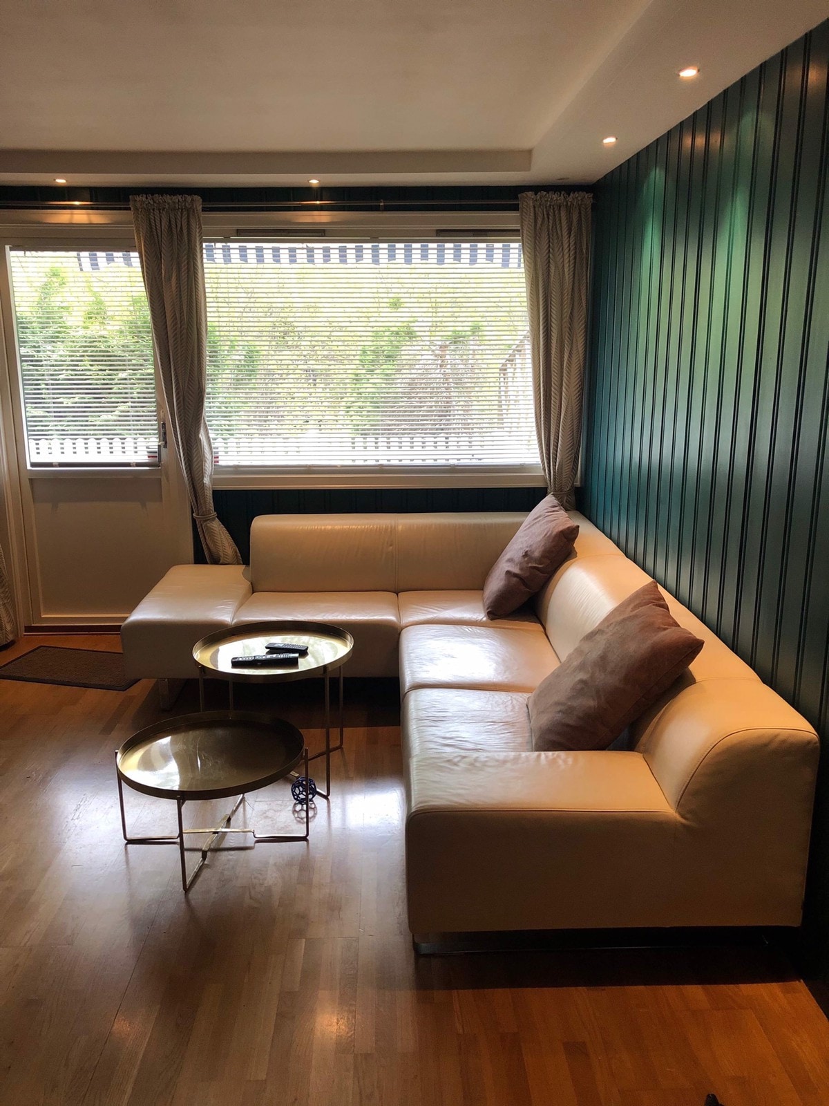 Lejligheden er ca. 55 m2 og er møbleret, har et nyt badeværelse og køkken, masser af skabe og er lys indeni. Der er vinduer på 2 sider; køkkenet har vindue med morgensol, og soveværelset/stuen har vindue, hvor solen er indtil ca. 21-22 om sommeren. Der er en dobbeltdør med glas i fuld bredde. Gratis område og skov ligger 100 meter væk, et eldorado for voksne og børn om sommeren og vinteren. Der er 8 minutters gang til købmanden og god kommunikation til Oslo centrum, Lysaker, Bekkestua, Sandvika osv.