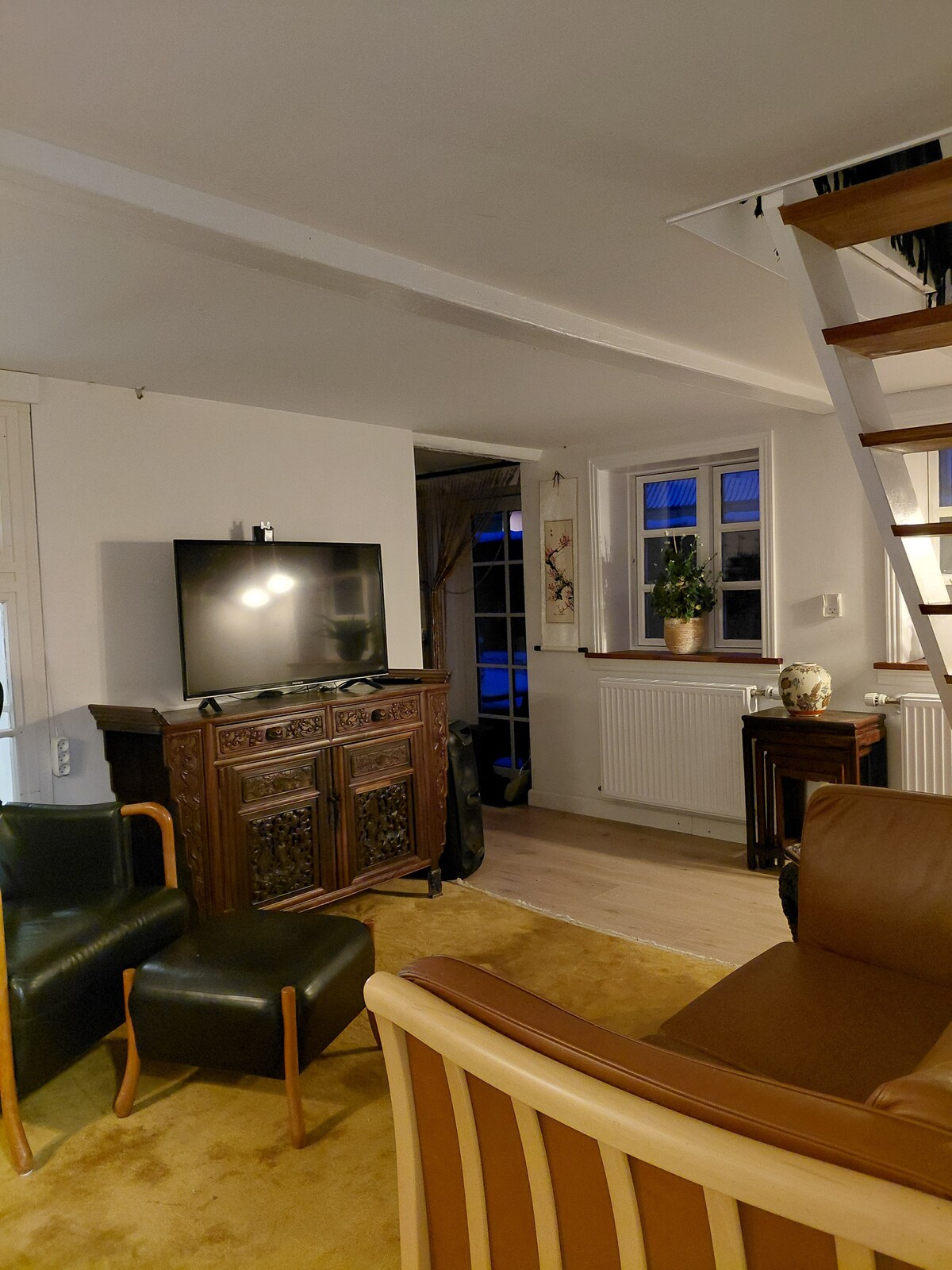 Lejlighed i 2 etager på ialt ca. 46 m2. MEGET lille toilet med bruser.. 48 cm på det smalleste sted. (toilet) Maybe the narrowest restroom in the world. Og 248 cm i længden. Havudsigt fra 1. sal, 600 meter til bystrand og havnebad. 1000 meter til skov og badestrand. 32" Smart TV på 1. sal. DR tv og svensk tv . Brug skærmspejling evt. (google home app) på mobil eller tablet. (Husforbi) 2 sengepladser på 1. sal med dyner, sengetøj og håndklæder vælg dobbeltseng eller 2 enkeltsenge.