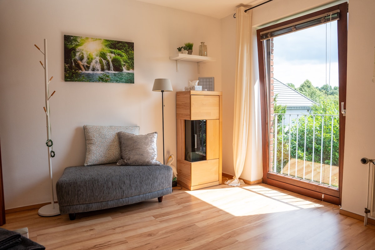 Det hyggelige opholdsområde med et soveværelse, privat badeværelse og køkken ligger på øverste etage i et charmerende fritliggende hus i et fredeligt boligområde, kun 5 km øst for Hamborgs bygrænse. Alle værelser er udelukkende til gæstens brug. Den kombinerede stue/soveværelse har en behagelig fransk seng (140 x 200 cm) og en sovesofa, der er perfekt til op til to gæster. Det moderne køkken og badeværelse giver alt, hvad du har brug for til et afslappende ophold.