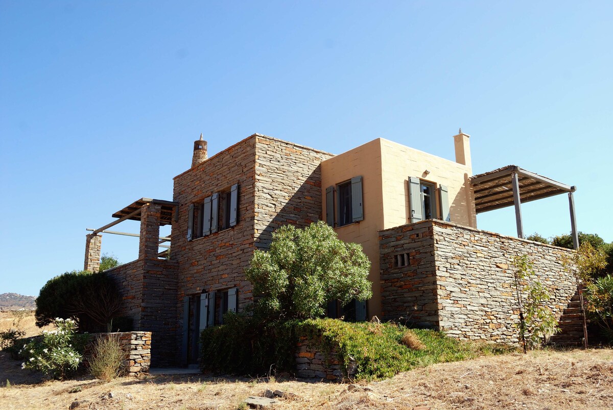 Smukt teiotiko moderne hus med smuk udsigt og solnedgang, roligt og hyggeligt med gennemtænkt dekoration. Du vil helt sikkert nyde det og have det sjovt på vores ø. Smukt kykladisk hus på landet med moderne elementer og dekoration, der respekterer den græske øarkitektur. Hus med masser af lys, flot udsigt over horisonten, solnedgang og havet, meget stille, ideelt til en dejlig græsk ferie. Også meget tæt på øens vigtigste butiksliv og 12 minutters gang til den nærmeste strand.