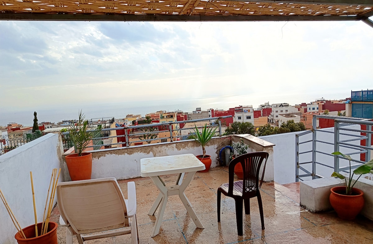 Vores bolig ligger i Tamraght, 16 minutters gang fra Taghazout Beach. Lejligheden er udstyret med to soveværelser, et køkken, et badeværelse og en balkon med havudsigt. Lejligheden ligger på tredje sal i vores gæstehus og er ideel til grupper og familier. Du har også adgang til en fælles terrasse med en fantastisk udsigt over byen og havet.