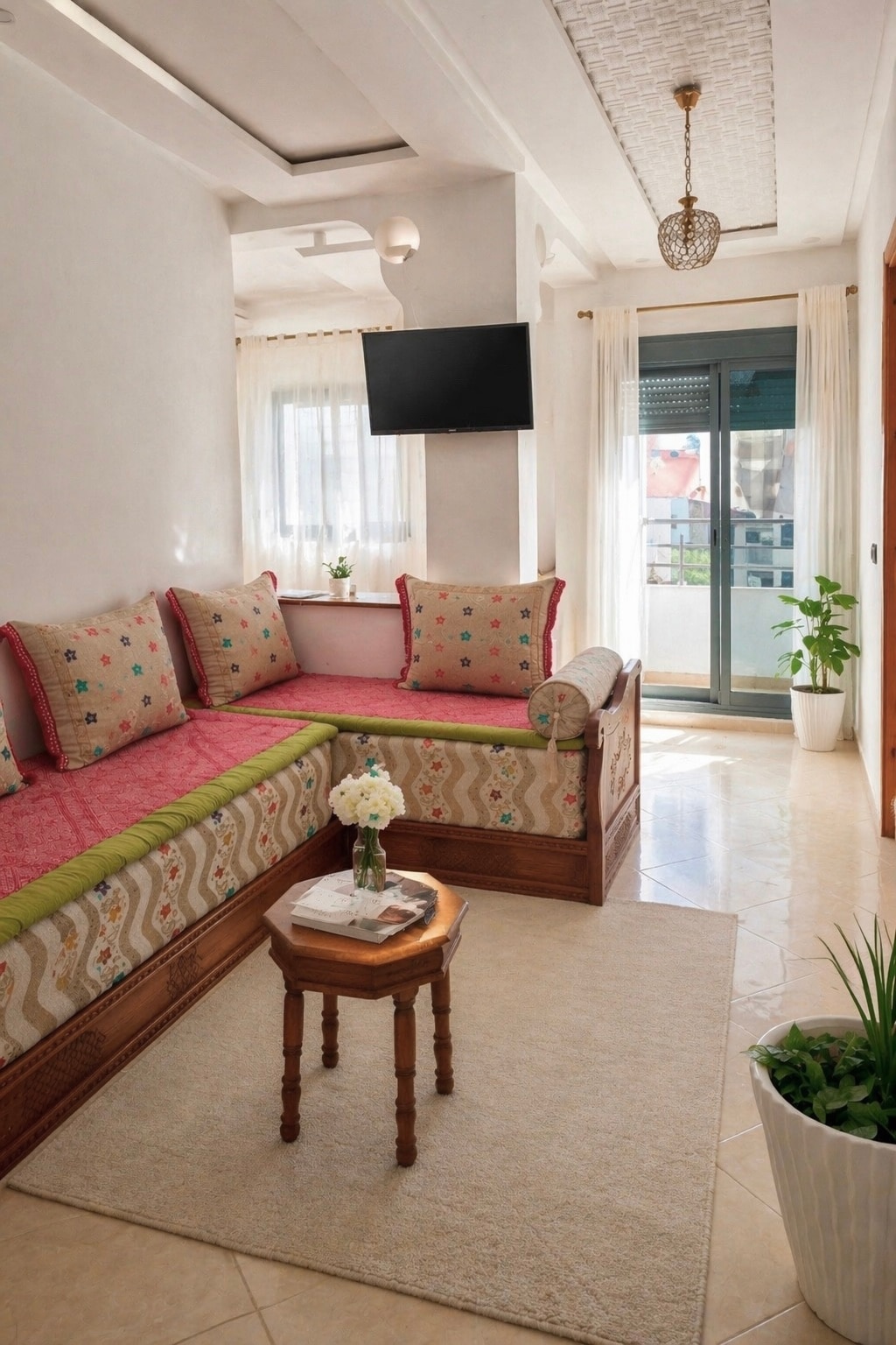 Profitez d’un séjour reposant à Ouezzane dans cet appartement spacieux et lumineux, idéal pour les familles ou les groupes d’amis. Il comprend deux chambres, un salon marocain chaleureux, une cuisine entièrement équipée et une salle de bain avec toilettes séparées. L’immeuble est équipé d’un ascenseur. Vous bénéficierez également d’un balcon agréable pour vous détendre et profiter de l’air frais. Situé dans un quartier calme, c’est l’endroit parfait pour un séjour agréable et reposant.