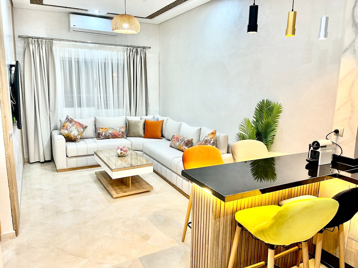 Logement neuf avec un emplacement procurant des avantages de proximité et de commodités variées :commerces, cafés, restaurants Ce bel appartement est idéal pour vous accueillir, Le prix convenable le rend parfait pour les voyageurs en solo ou couple marié. Logement bien ensoleillé composé d'une chambre avec Lit double, une autre chambre avec 2 lit séparés ,un salon avec Clim , cuisine équipée et salle de bain