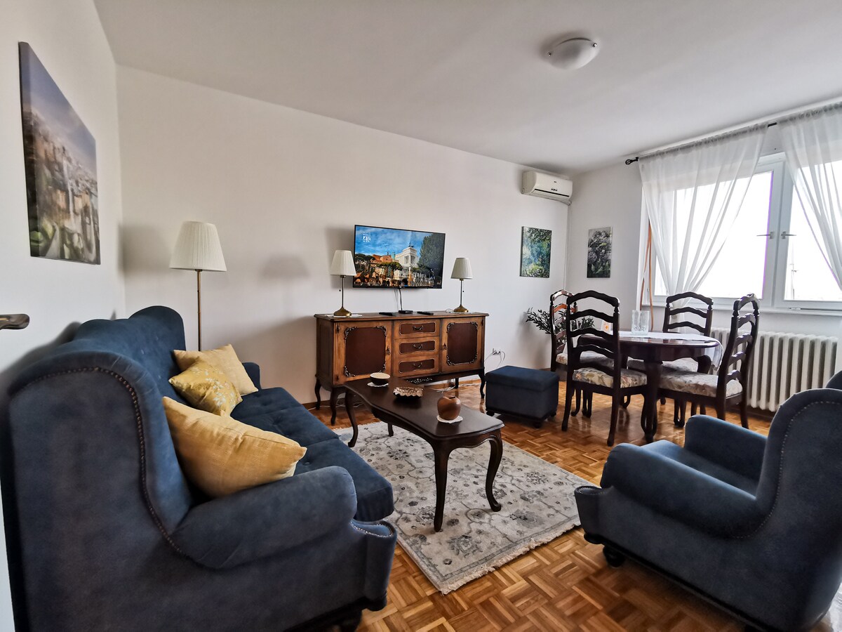 Moderne, fuldt renoveret lejlighed i New Belgrade; kun en kort gåtur fra Sava Centar og Belgrade Arena. Beliggende på 1. sal i et roligt boligområde med nem adgang til motorvejen og centrum. Nyd indtjekning uden vært, en komfortabel kingsize-dobbeltseng, et fuldt udstyret køkken og badeværelse, hurtig gratis wi-fi og et UHD Smart TV. Designet til komfort og bekvemmelighed. Sen udtjekning er tilgængelig mod et ekstra gebyr, afhængigt af tilgængelighed.