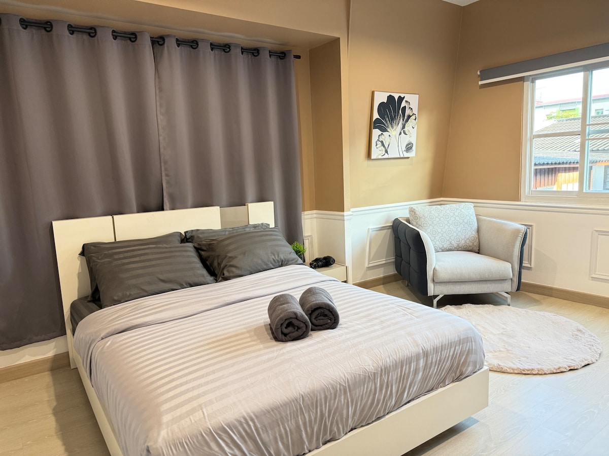 Nyd den moderne charme i dette pæne indrettede værelse. Fuldt møbleret med alle elektriske apparater, der forbedrer komforten under dit ophold! Hele boligen vil være din [soveværelse, badeværelse, køkken og opholdsrum] Blød og komfortabel kingsize-madras og Muji-sengesæt. Gratis Wi-Fi, 60" SmartTV + gratis Netflix, luftrenser, vaskemaskine med tørrefunktion, strygejern, mikrobølgeovn, køleskab, elektrisk kogeplade og køkkenredskaber. Badeværelse med regnbruser og varmtvandsmaskine.