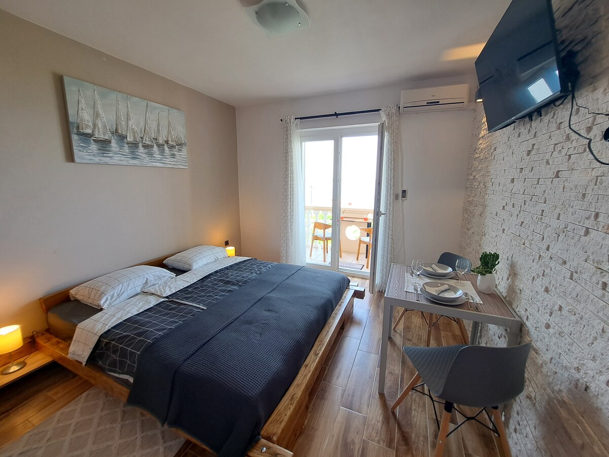 **Nystenlejlighed tæt på havet med fantastisk havudsigt**. Lejlighed 55 m2 for 2 + 1 gæster . Rummelig stue med sofa, der bliver til en dobbeltseng (smart-tv, aircondition)Køkken (ovn, opvaskemaskine, kaffemaskine). 1. Soveværelse (stor dobbeltseng, bred garderobe) med toilet (bruser). Lejligheden har en privat terrasse (10 m2) med fantastisk havudsigt. Terrassen indeholder et bord til 4 personer.