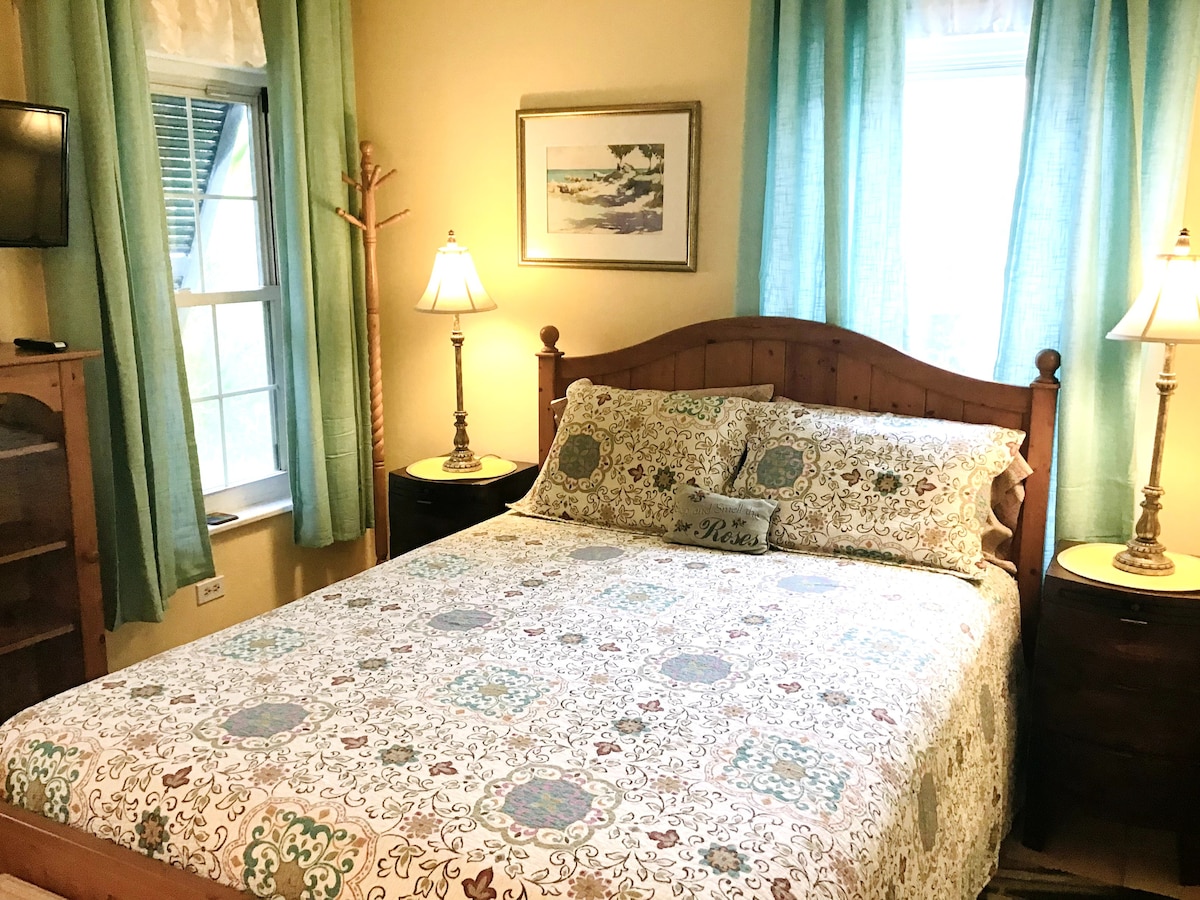 Moderne stor lejlighed med et soveværelse, med stor stue/spisestue, centralt beliggende i smukke Paget Parish. Roligt beboelsesområde med træer overalt. Tæt på Elbow Beach (15 minutters gang væk) og Railway Trail (5 minutters gang væk), som er perfekt til lange gåture. Hovedbusruten er bekvemt placeret i bunden af indkørslen. Restauranter, dagligvarebutikker og apotek ligger alle i nærheden. Grill, aircondition, wi-fi, dedikeret Twizi-bil stikkontakt og parkeringsplads.