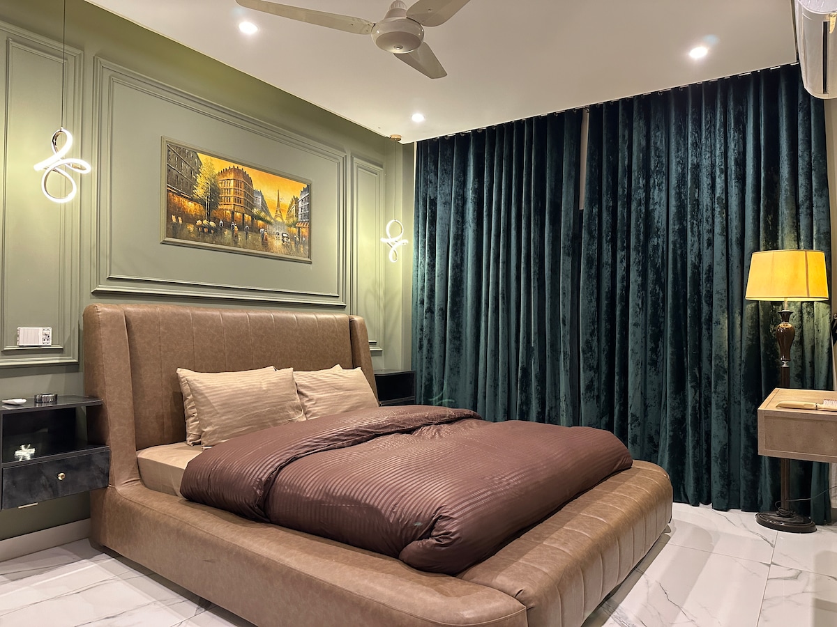 Our 1 BR condo in DHA Phase 5 is where urban chic meets celestial cool. Think: a glowing moon wall for those late-night selfies and a bold dollar-stacked art piece that screams "main character energy" Wake up to park views from your private balcony swing, binge your faves on the 50" 4K Smart TV, or cook up something aesthetic in the fully loaded designer kitchen. The interiors? Abstract, stylish, and made for the feed. Plus, you're right next to Lahore's hottest dining spots.