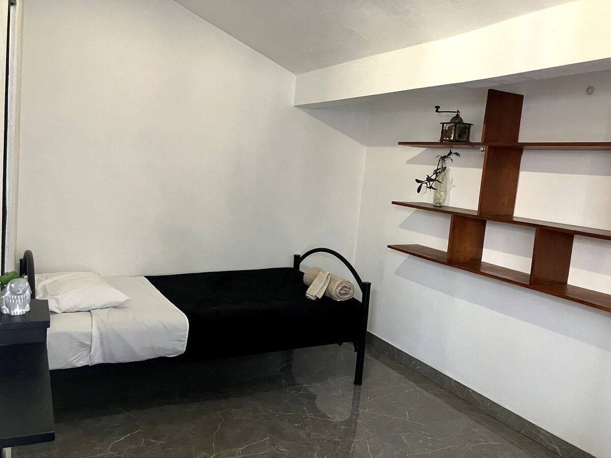 ✔ Komfortabel, stille, smuk og ren med enkeltseng. ✔ 5 minutter fra Mexico Citys lufthavn. ✔ Med fælles terrasse. I ✔ nærheden af FORO SOL og PALACIO DE LOS DEPORTES, hvis du kommer til en koncert. ✔ Hvis vi kan arrangere det, kan vi hente dig og køre dig til lufthavnen (250 MXP). ✔ Vi har overvågning i bygningen 24 timer i døgnet for din sikkerhed. ✔ En lækker mexicansk morgenmad med kaffe, frugt og brød, når du vågner. Beliggende ✔ ved siden af den daglige gymnasium 237
