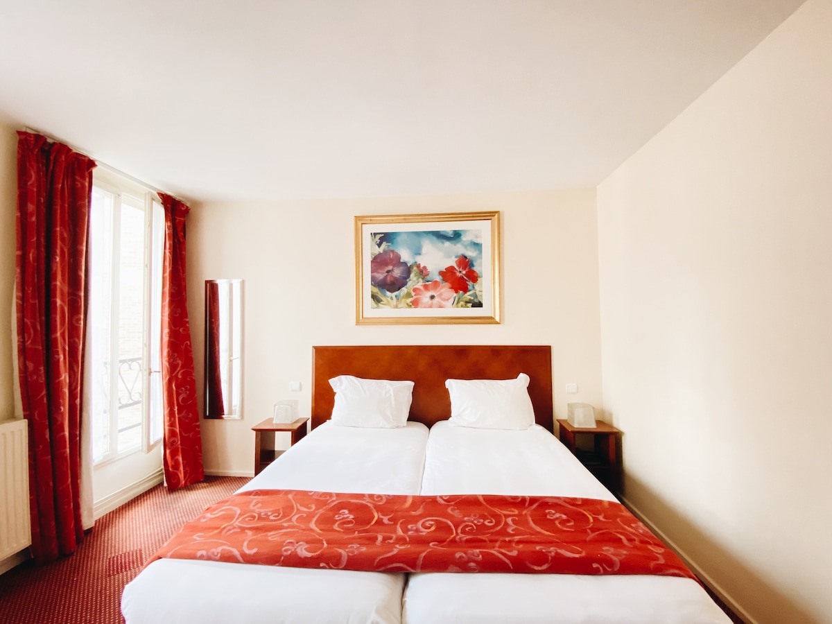 These classic double rooms offer excellent value & 3-star service in the heart of Paris, featuring fresh decor with light colors and elegant dark wood furniture. Large windows invite plenty of natural light, creating a bright and welcoming space. Modern amenities include a minibar, sound insulation, safe, private bathroom with shower & hair dryer, flatscreen TV, radio, and free wireless internet. This non-smoking room also comes with a phone and awakening service for your comfort & convenience.