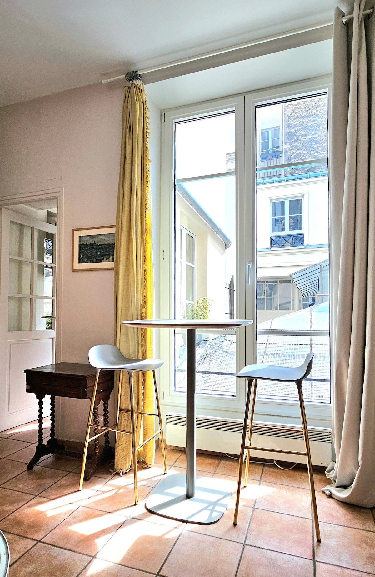 Denne sofistikerede lejlighed på 110 m2 har parketgulv i sildebensmønster, fine møbler og masser af naturligt lys og tilbyder en lys, elegant, varm og luksuriøs atmosfære. Lejligheden, med pejs og lister, der kombinerer charme, ro og komfort, ligger i en af de ældste passager i det historiske centrum af Paris. Denne lejlighed har en officiel turistindkvarteringslicens. Så det er helt lovligt.