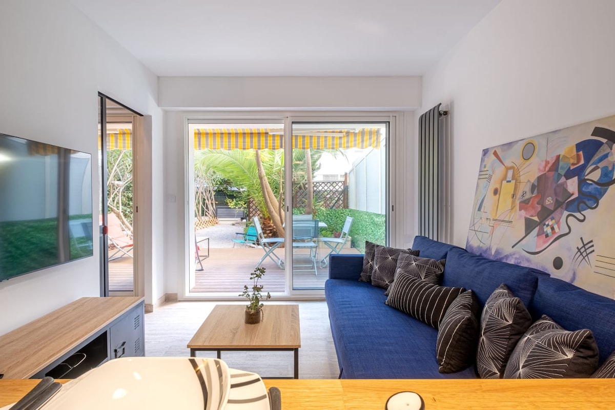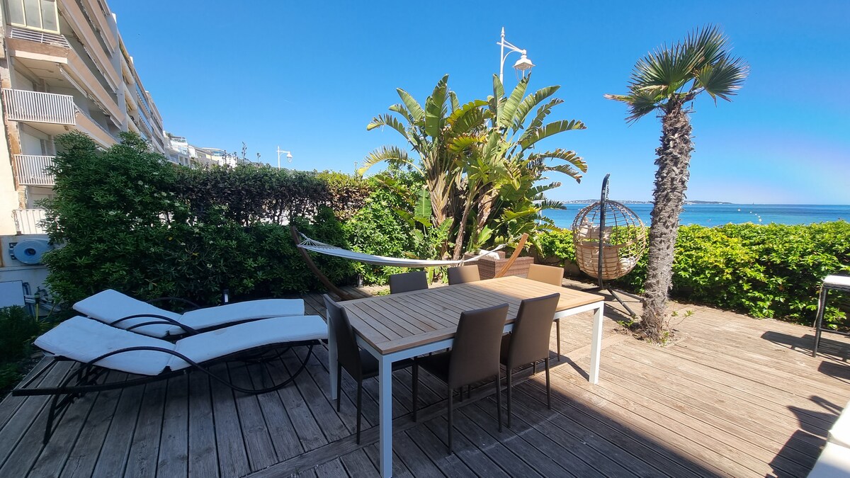Appartement haut de gamme refait à neuf JUSTE DEVANT LA PLAGE, à seulement 10 SECONDES à pied de la plage, en plein CANNES. PALM BEACH Living room avec baies vitrées ouvrant sur TERRASSE en rez de JARDIN PRIVÉ rien que pour vous 2 chambres confortables. 2 douches 2 wc. Chauffé, clim Équipement de qualité. Fibre Quartier STATIONNEMENT GRATUIT. Bus station COMMERCES RESTAURANTS Dans CANNES quartier chic et touristique Croisette PALM BEACH PANIER PETIT-DÉJEUNER et les FRAIS DE MÉNAGE OFFERTS.