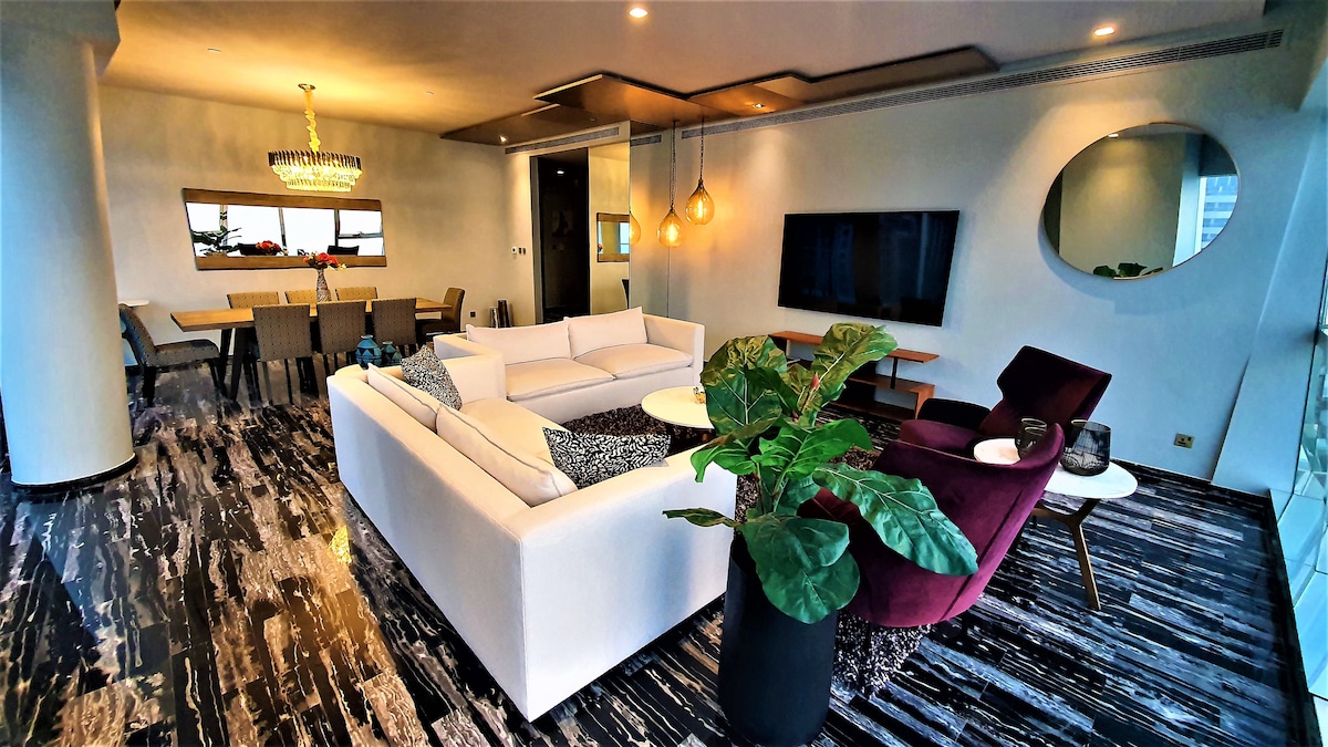 Nyd at slappe af i den private pool og solnedgange med udsigt over havet. Denne 275 kvadratmeter store lejlighed med privat terrasse ligger på 42. etage i Jumeirah Beach Residence. Stranden ligger en kort gåtur væk, og området er fuldt udstyret med restauranter, barer og butikker. Det er heller ikke langt fra Bluewaters Island og Dubai Eye. Det er nemt at komme rundt til fods, med sporvogn eller taxa. Bemærk, at adgangen til bygningen fungerer via Face ID og kræver kopi af pas og digitalt billede af alle gæster.