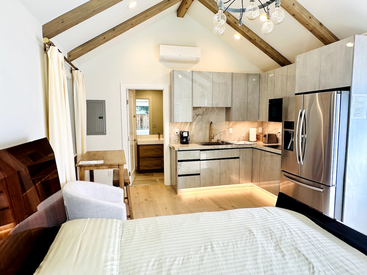 Velkommen til Savvy Studio~en ren og rolig lejlighed, hvor du kan slappe af eller arbejde i fred. Beliggende i en selvstændig fløj af et flot Eichler Mid-Century-hjem, gå ind gennem en privat unik atrium-breezeway til den låsende indgang til din studiolejlighed, der har en komfortabel fuld størrelse seng, bord til arbejde eller spisning, minikøkken og privat komplet badeværelse.