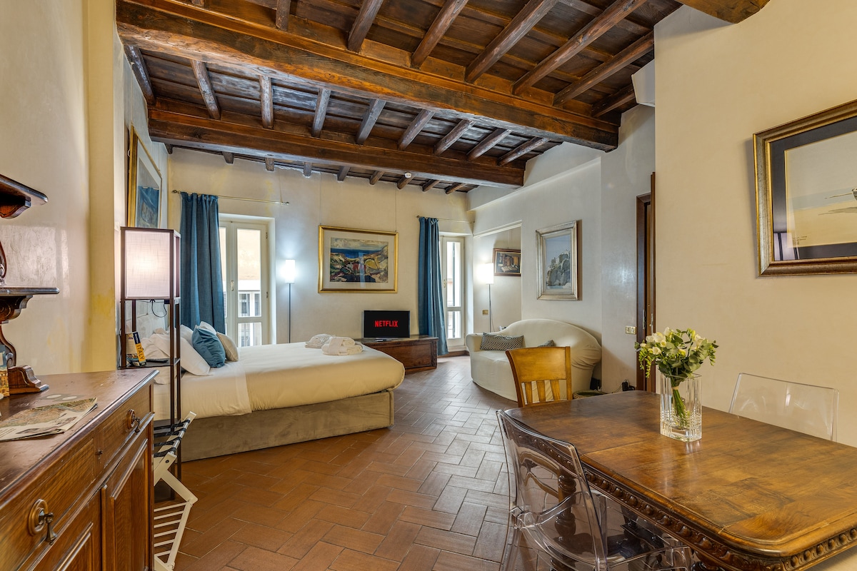 Eccezionale posizione a pochi metri da Piazza Navona,e da tutte le maggiori attrazioni, nella storica Via del Governo Vecchio, una strada famosa per i ristoranti, i bistrot, le botteghe e gli antichi palazzi. Al quarto piano, con ascensore, l'appartamento è silenzioso ed è composto da una camera da letto, un soggiorno con divano letto matrimoniale e cucina a vista, una cabina armadio/ripostiglio e un grande bagno. Dotato di WiFi, aria condizionata e smart TV.