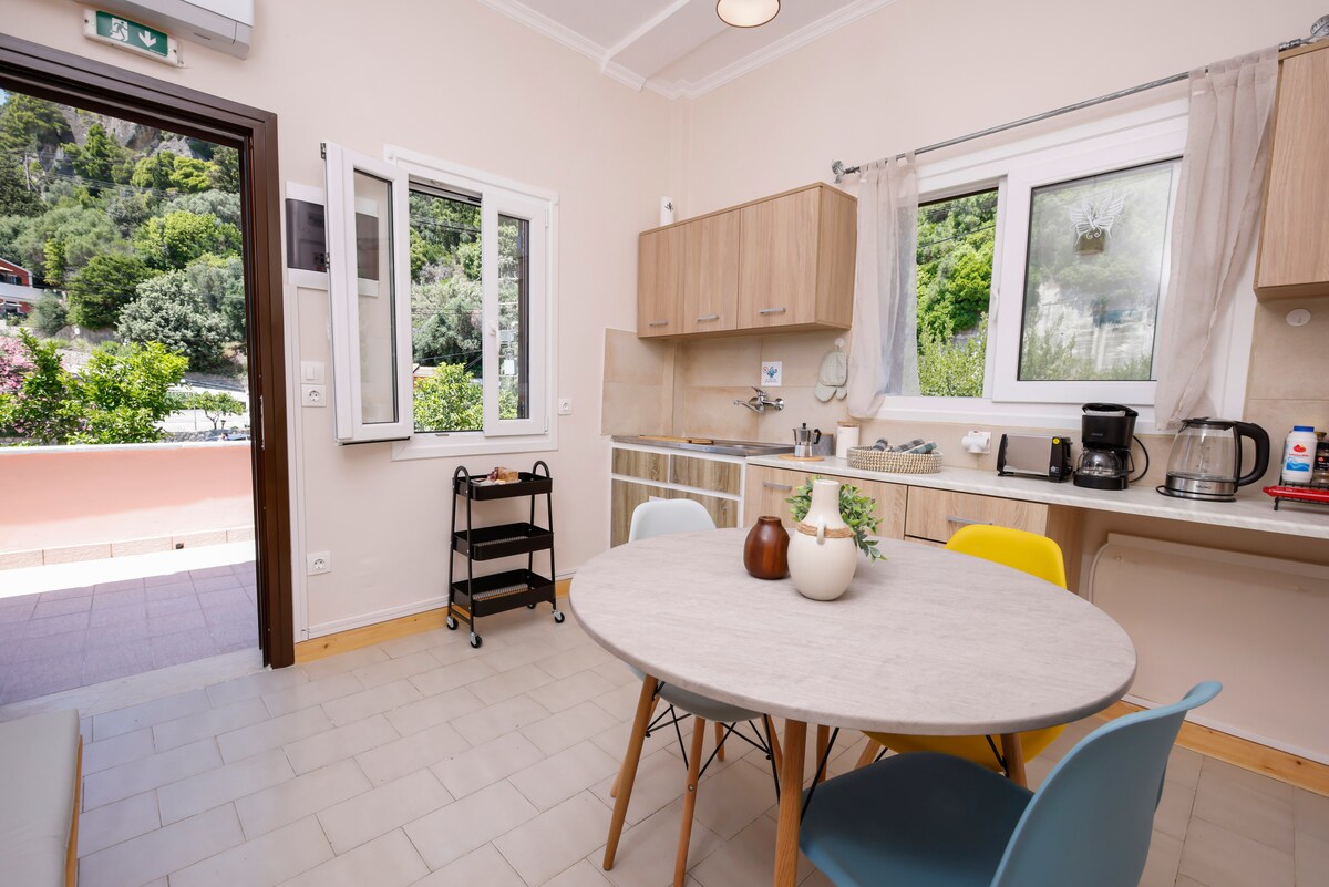 Our fully renovated with modern style apartment with its small yard is set over one of the most beautiful beaches of Corfu island. It is ideal for couples looking for a great time in a great area. The fully equipped modern open kitchen allows you to cook and enjoy your meals overlooking the sea. Comfortable sofa, big LCD smart flat screen and cable satellite TV, fully AC, sofa, Cocomat double bed. Shower bathroom. Starling satellite WiFi is also installed in the apartment !
