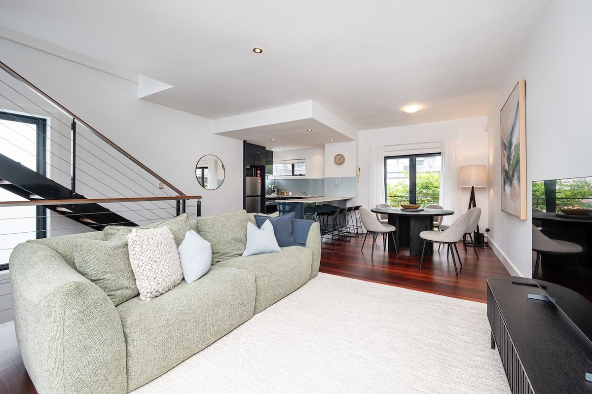 Nær nyt byhus med TRE klimaanlæg (varme/køling), et i hvert rum. SOFAEN ER UDSKIFTET (nu 1,44 m x 2 m). 2 soveværelser, 2 komplette badeværelser. Kingsize-seng (1,8 m x 2 m) i soveværelset ovenpå. To enkeltsenge i soveværelset nedenunder. Behagelige madrasser med lommefjedre og euro-toppe. 65-tommers smart-tv Hurtig wi-fi med NBN-netværk. Fuldt udstyret køkken og kvalitetsapparater. Vaskemaskine og tørretumbler En balkon, hvor du kan slappe af og mærke brisen.