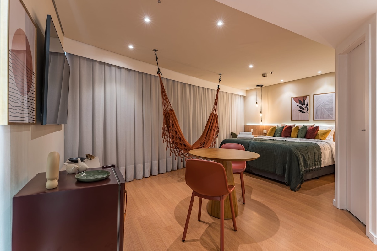 Enjoy the bohemian and artistic Vila Madalena, full of bars, restaurants and cafes. You can get to know the region or even take a tour to city parks with a bike, avaiable free of charge. Will you come to work? Focus on it at the confortable table facing the green balcony with a beautiful view of the tree tops. After all, enjoy the gym, poll, sauna and snooker room for your complete leisure.