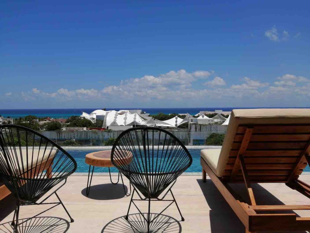 Velkommen til KAAB! Vores moderne luksusstudie ligger, hvor alt er 5 minutters gang væk. 5 minutter til Cozumel-færgen, 5 minutter til ADO-busterminalen for adgang til Cancun lufthavn, 5 minutter fra stranden eller til den berømte 5th avenue. Tagterrassen løber parallelt med havet for panoramaudsigt. Der er også et fitnesscenter. Vores studie har plads til tre gæster, fuldt køkken, Wi-Fi 100 mbps fiber, smart-tv og vaskemaskine. Der er sikkerhed døgnet rundt og betalt offentlig parkering kun en blok væk.