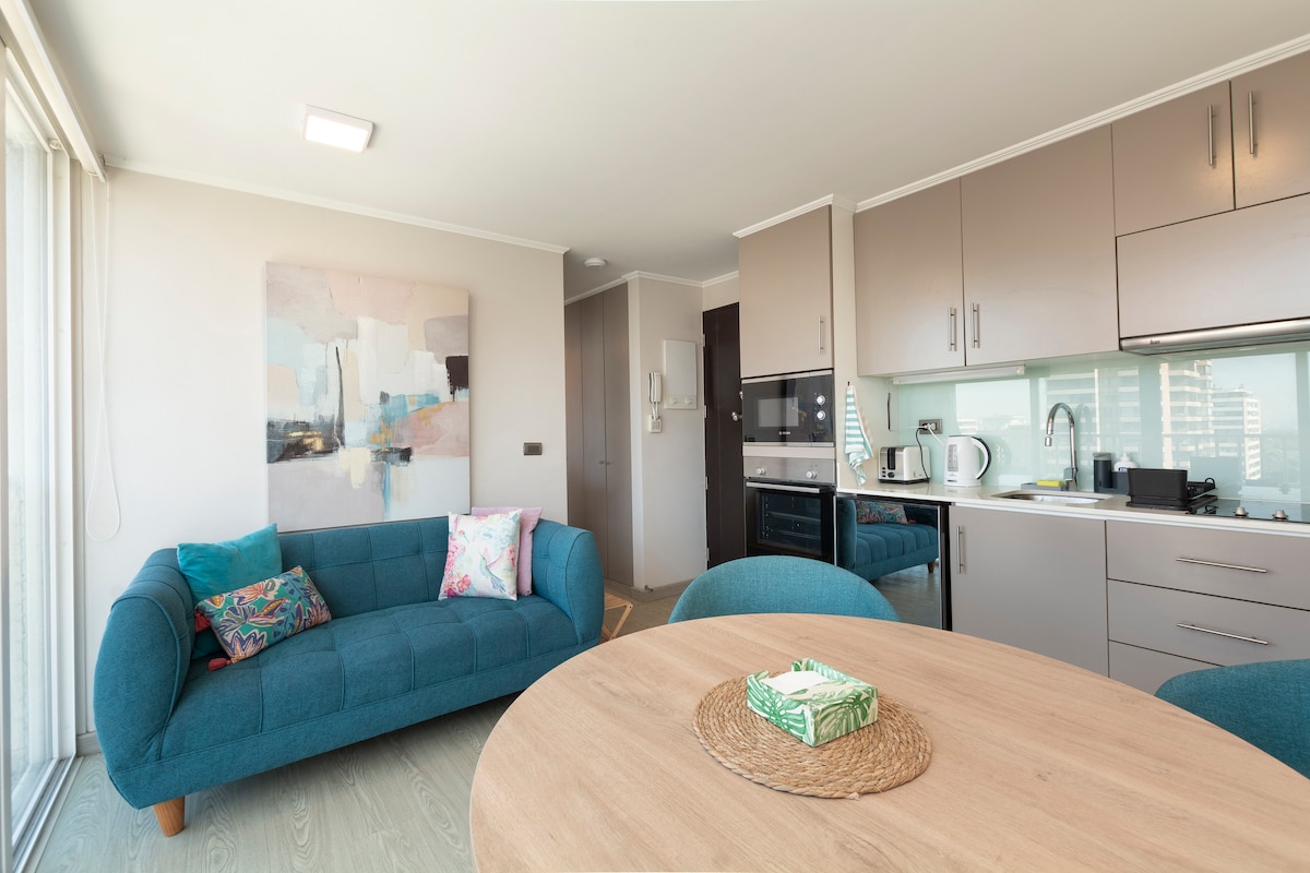 Moderne lejlighed med spektakulær udsigt over bjergkæden, få skridt fra Parque Arauco Mall. Opvarmet pool, fitnesscenter, døgnvagt og parkering. To soveværelser, kingsize-seng + 2 enkeltsenge, dobbelt sovesofa i stuen, 2 badeværelser, lukket terrasse med vinduesbeskyttelse, ideel til familier. Vaskemaskine/tørretumbler, opvaskemaskine, højhastigheds-Wi-Fi og skrivebord. Fuldt udstyret til komfortable, sikre og funktionelle ophold.