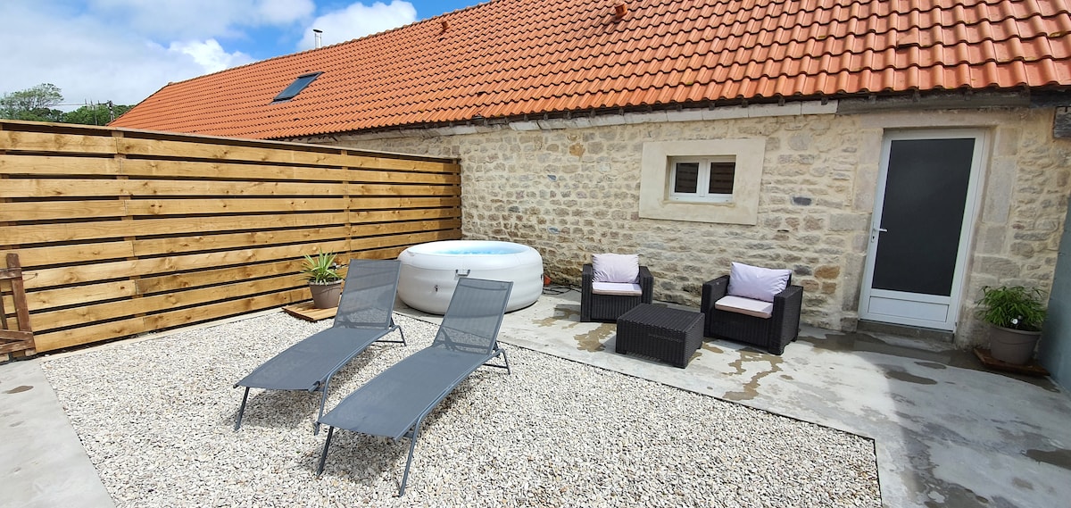 Oplev denne rolige og varme lade med en pæn indretning på 30 m2 atypisk med mezzanin, gamle sten og fritliggende bjælker. Du vil finde den store private gårdhave ikke overset til at slappe af med jacuzzi (fra april til september), solsenge, havemøbler godt eksponeret. Midt på markerne er vores landsby ideelt beliggende 10 minutter fra Wimereux-stranden, Boulogne sur mer, Nausicaa, de to capes, Ambleuteuse og tilstødende Marquise og dens butikker.