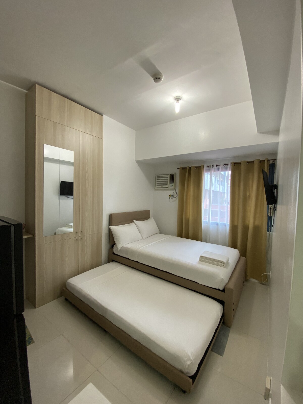 * Et hyggeligt soveværelse, åbent plan, selvforsynende fristed. Plads til maksimalt 4 gæster. * Overnatning på Azure Urban Resort tilbyder en hvid sand- og kunstig strand med børnepool i Filippinerne. Oplev den unikke, komfortable og luksuriøse måde at slappe af på det eneste strandresort i byen. * Gæster har gratis adgang til Paris Beach Club og restauranten og betaler 250 pesos for svømmebånd per person per skift AM/PM for at få adgang til bølgebassinet.