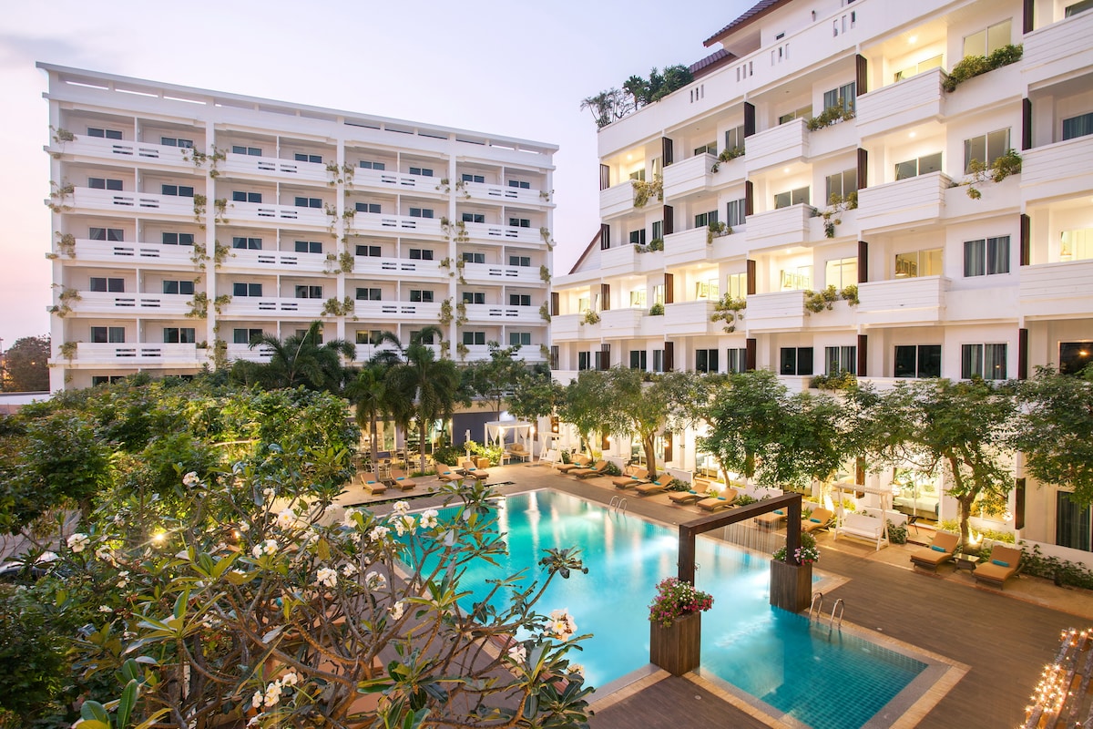 Mido Hotel Pattaya ligger i et roligt og bekvemt område af Pattaya, væk fra trafik og støj, med en afslappet og hyggelig atmosfære.Hotellet har en rummelig udendørs pool omgivet af tropisk grønt og traditionel thailandsk arkitektur, hvilket skaber et resort-lignende roligt miljø.Fællesområdet er åbent og komfortabelt med liggestole og skyggefulde siddepladser ved poolen, hvor man kan slappe af hele dagen.Hotellet er roligt og komfortabelt, og det er også meget praktisk at tage til Pattaya Beach, indkøbscentre, restauranter og forskellige seværdigheder. Det er et ideelt valg for både komfort og bekvemmelighed.