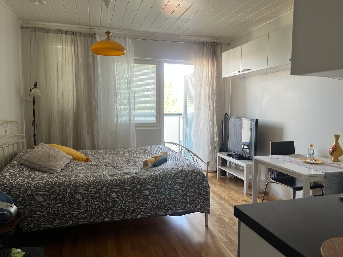 Stilfuld, 4-etagers lejlighed på 29m2 med balkon på Pielisjoki-stranden. Den nærmeste butik ligger lige ved siden af, og Joensuu centrum ligger på den anden side af floden. Lejligheden er møbleret specielt til brug på Airbnb, og vi har forsøgt at tage hensyn til alle gæsternes mulige behov (foldbart arbejdsbord, sovesofa, højhastighedsinternet, veludstyret køkken). Gæsterne har adgang til en parkeringsplads med stikkontakt direkte foran hoveddøren, og nøglerne til lejligheden findes i kodeboksen på varmepælen.