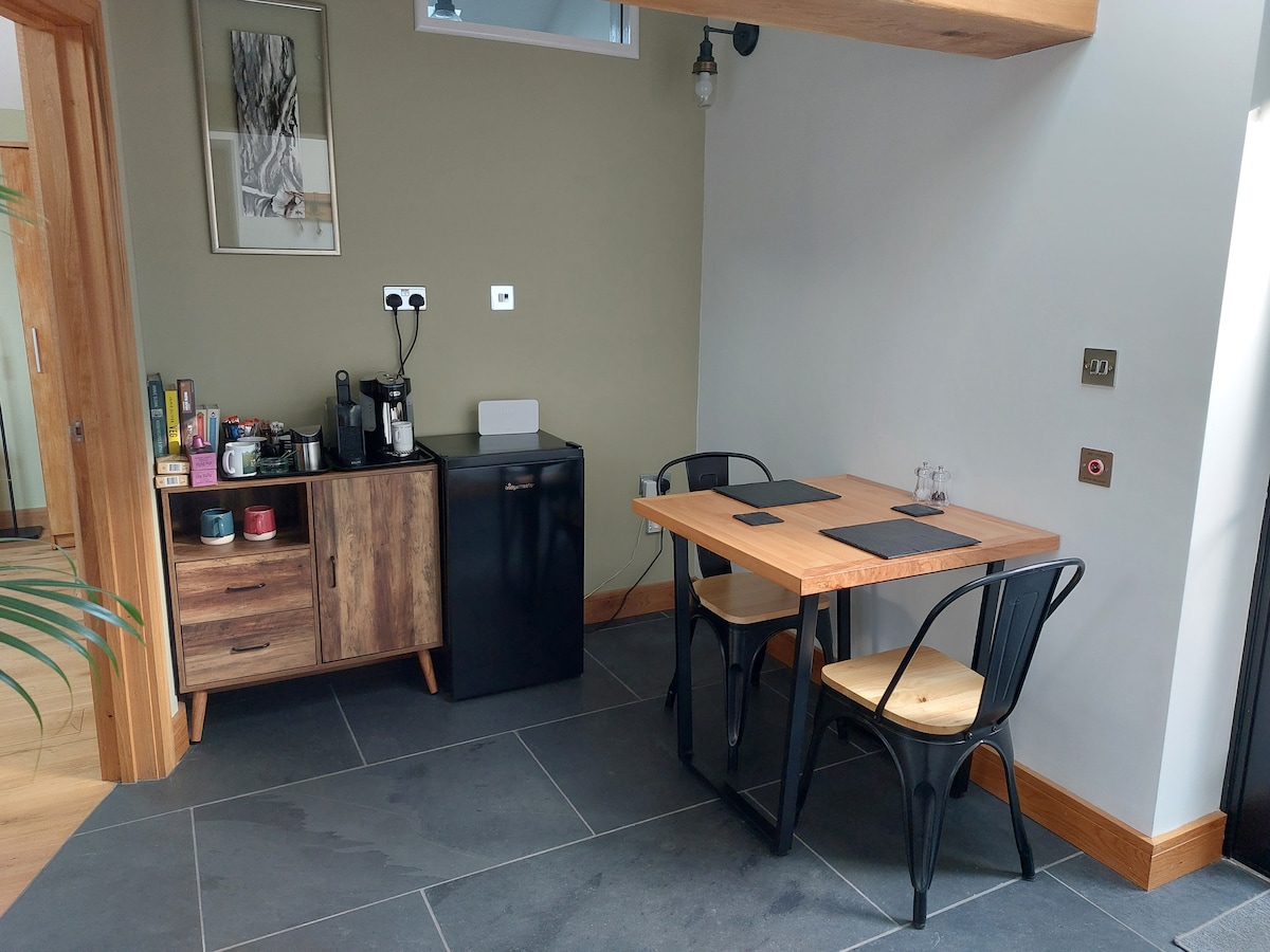 Nybygget smuk selvstændig enhed beliggende på første sal i en fritliggende bygning inden for grænsen af et familiehjem. Stort opholds-/soveområde med en luksuriøs kingsize-seng, opholdsområde og te- og kaffefaciliteter. Nyligt installeret køkkenområde med køleskab: ovn og mikrobølgeovn. Stort smart-tv. Ekstra dagsseng gør suiten perfekt til familier. Separat badeværelse med elektrisk bruser. Privat udendørs siddeområde med udsigt over det smukke Monmouthshire-landskab