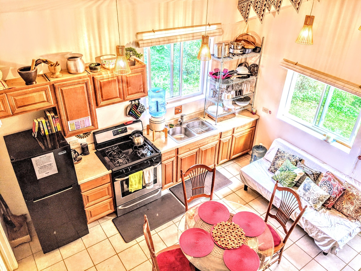 En smuk udflugt omgivet af natur på en kakaofarm! Etværelses + loftshytte, fuldt køkken, badeværelse, vaskemaskine, solrig lanai, på vores Big Island off-grid permakulturgård. Hytten ligger i en fødevareskov et par hundrede meter fra et fantastisk vandfald med et badehul i en fredelig bambuslund. En kingsize-seng i soveværelset, to enkeltsenge på loftet, som har lavt til loftet og er tilgængeligt via stejle, smalle trapper. Gratis adgang til botanisk have. Økologiske æg, hjemmelavet chokolade på gårdens stand!