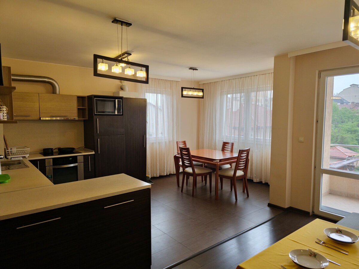 Hyggelig lejlighed på Buxton Brothers Blvd. Et travlt område, hvor du finder mange restauranter, bagerier, butikker og offentlige transportstoppesteder. Det ligger mindre end 20 minutter fra centrum med offentlig transport, du har også forbindelse med sporvogn og metro. Lejligheden har en smuk udsigt over Vitosha. Det er kæledyrsvenligt. Den har en sovesofa i stuen med plads til to personer. I det andet rum er der en dobbeltseng med et helt fantastisk hjemmekontorhjørne til dem, der arbejder hjemmefra.