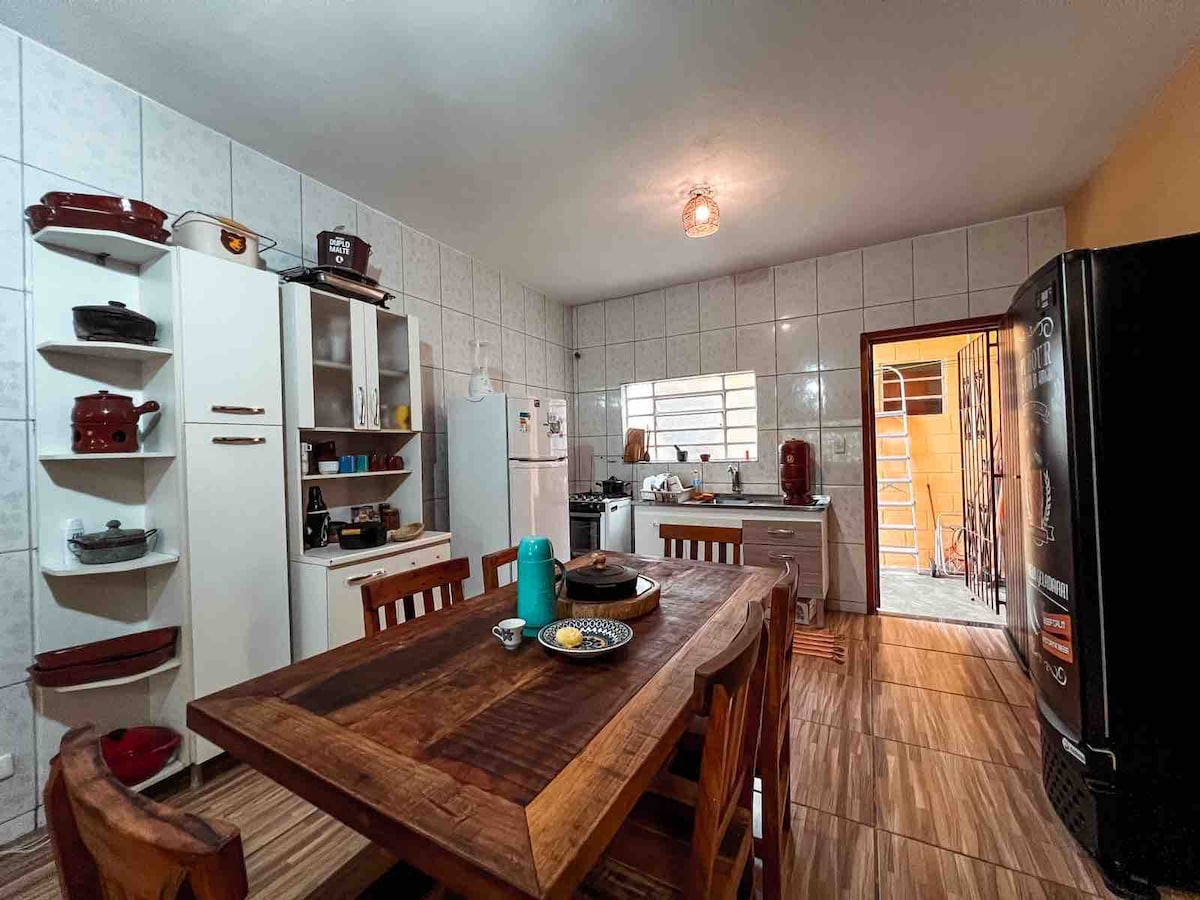 Etetagers hus, der er ideelt til to gæster, et privat område, 500 meter fra stranden, fantastisk beliggenhed: tæt på restauranter, bagerierne Peg Pão og Pão de Maçã, Extra-supermarked, Sodiê Doces, Panobianco-fitnesscenter. Fuldt udstyret køkken, stort soveværelse med eget badeværelse og ventilator, veranda bagved huset med hængekøje og et grillområde i stueetagen. Parkering til en lille eller mellemstor bil.