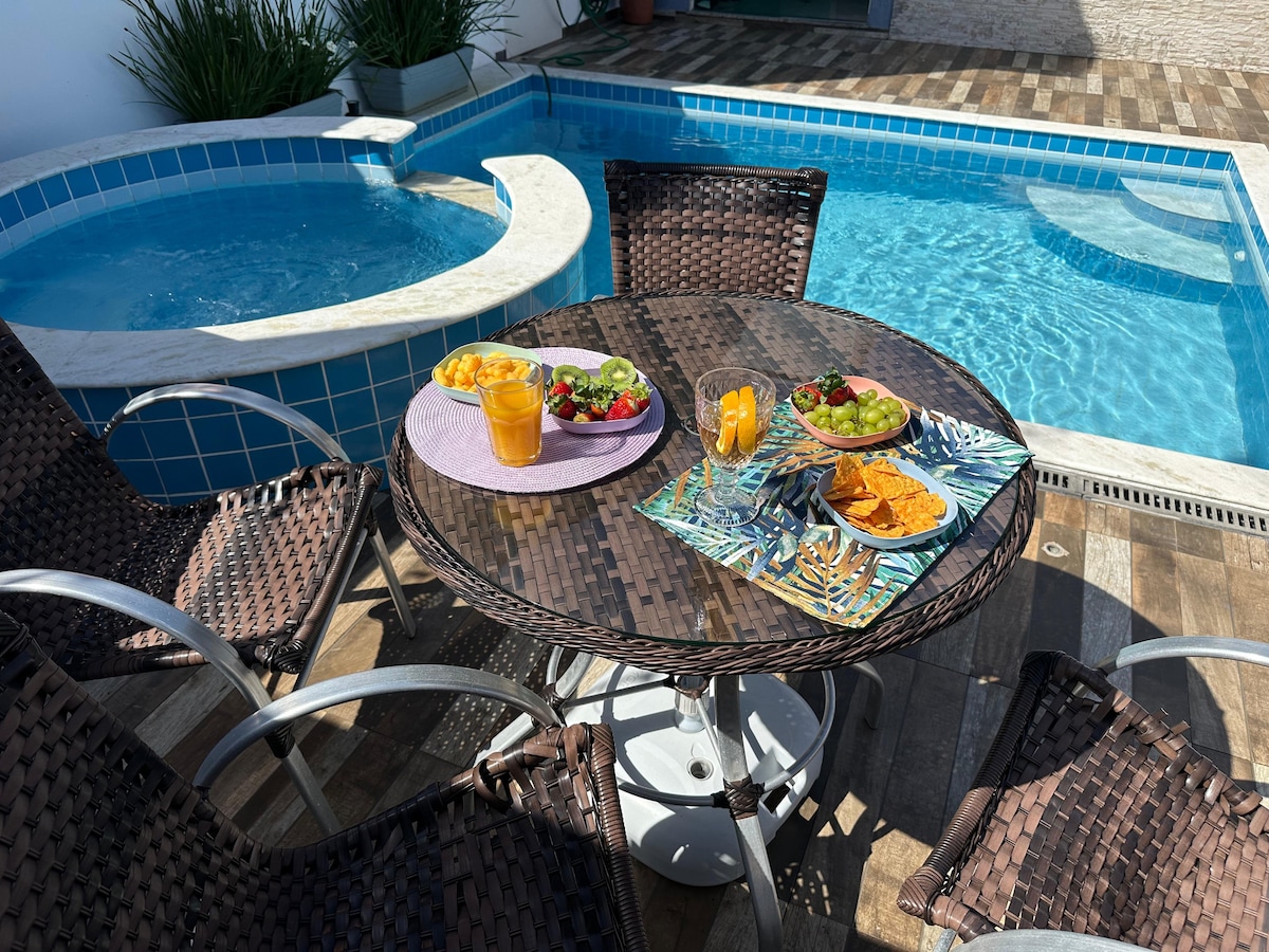 Fremragende hus i Oásis-kvarteret, Peruíbe - SP. Fantastisk beliggenhed, tæt på supermarkeder og andre faciliteter. 800 m fra stranden. Den har 2 parkeringspladser, 3 soveværelser, 6 senge, en stor græsplæne, kroge til hængekøjer, et poolbord, et område med grill. Køkken med komfur, mikrobølgeovn, køleskabe, husholdningsapparater, aircondition, 55 tommer Smart TV, 120 megas internet, Wi-Fi. Pool med spa og LED-lys om aftenen. Jeg accepterer kun små/mellemstore kæledyr.
